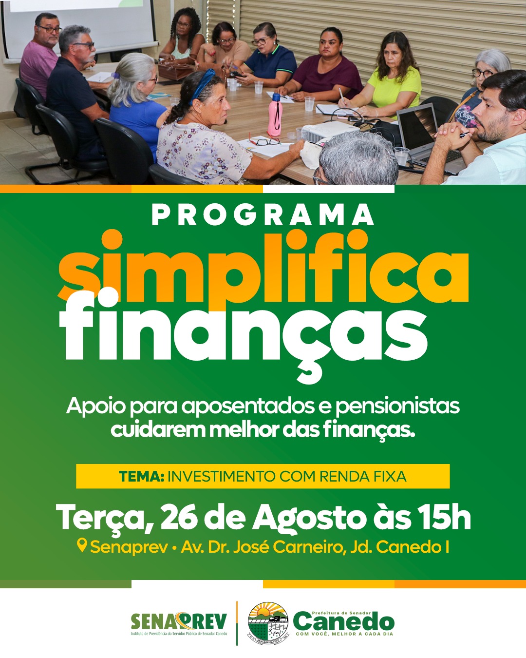 O Senaprev realizará mais uma edição do Programa Simplifica Finanças, com o tema “Investimento com Renda Fixa”. O encontro teve como objetivo orientar aposentados e pensionistas sobre como cuidar melhor de suas finanças, proporcionando mais segurança e planejamento para o futuro.