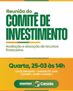 O SENAPREV convida os membros e interessados para a Reunião do Comitê de Investimento, que terá como pauta a avaliação e alocação de recursos financeiros do Regime Próprio de Previdência.