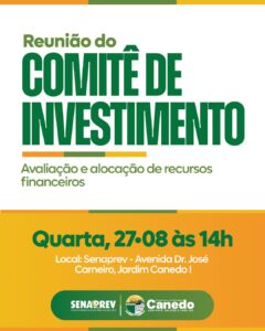 O Senaprev irá promover a Reunião do Comitê de Investimento, voltada para a avaliação e alocação dos recursos financeiros do instituto. Um momento importante para garantir uma gestão responsável e eficiente, sempre pensando na segurança e no bem-estar dos segurados.