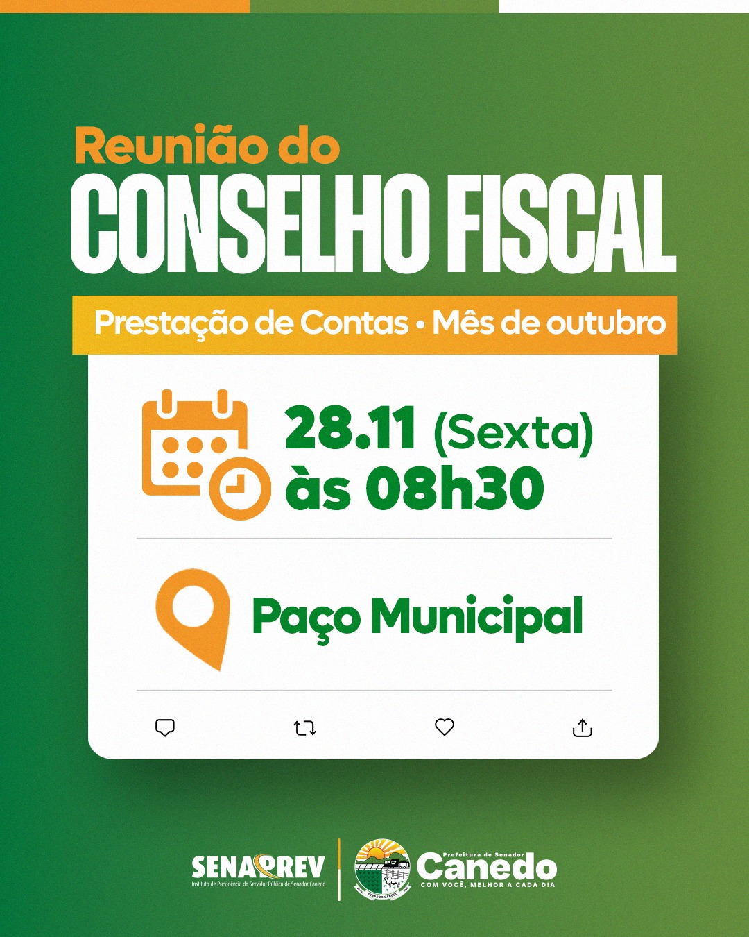 Informamos que a reunião referente à prestação de contas do mês de outubro será realizada nesta sexta-feira, dia 28/11, às 08h30, no Paço Municipal.