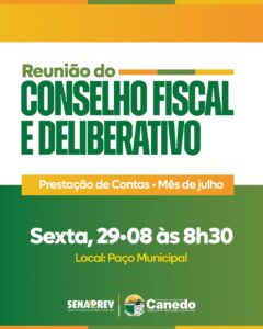 Acontecerá no Paço Municipal a Reunião do Conselho Fiscal e Deliberativo do Senaprev, referente à prestação de contas do mês de julho. O encontro reforça o compromisso com a transparência e a responsabilidade na gestão dos recursos previdenciários.